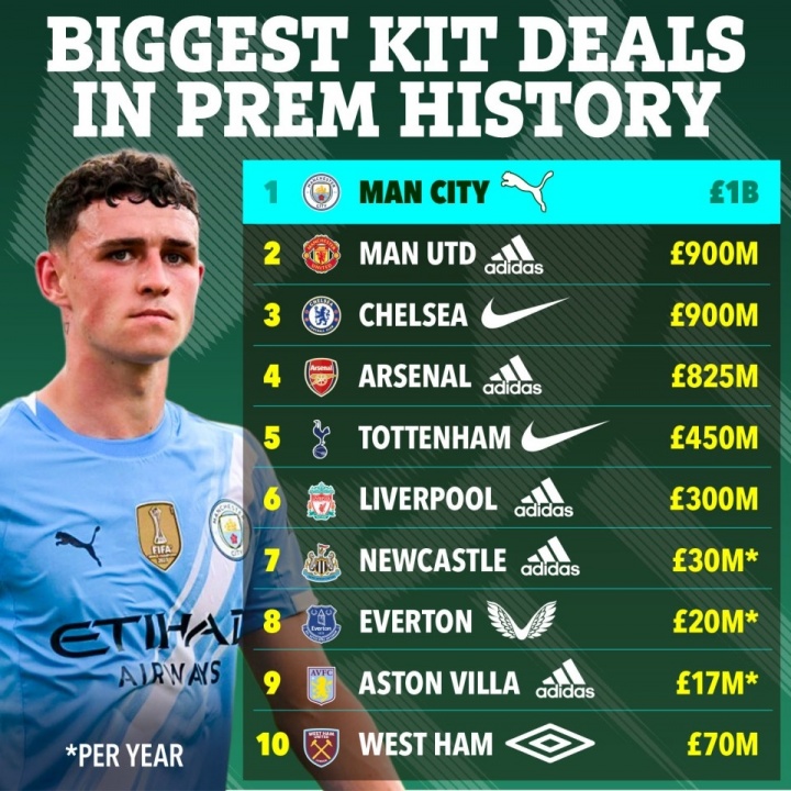 曼彻斯特城的合同还超过了曼联和阿迪达斯签署的9亿英镑合同,以及皇家马德里和阿迪达斯之间8年的9.5亿英镑合同,成为足球历史上最大的泽西岛赞助合同。